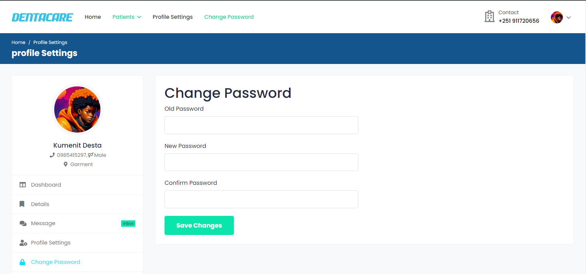 Dentacare offers patients the flexibility to manage their accounts, including changing passwords and updating profile information, ensuring data security and personalized access.