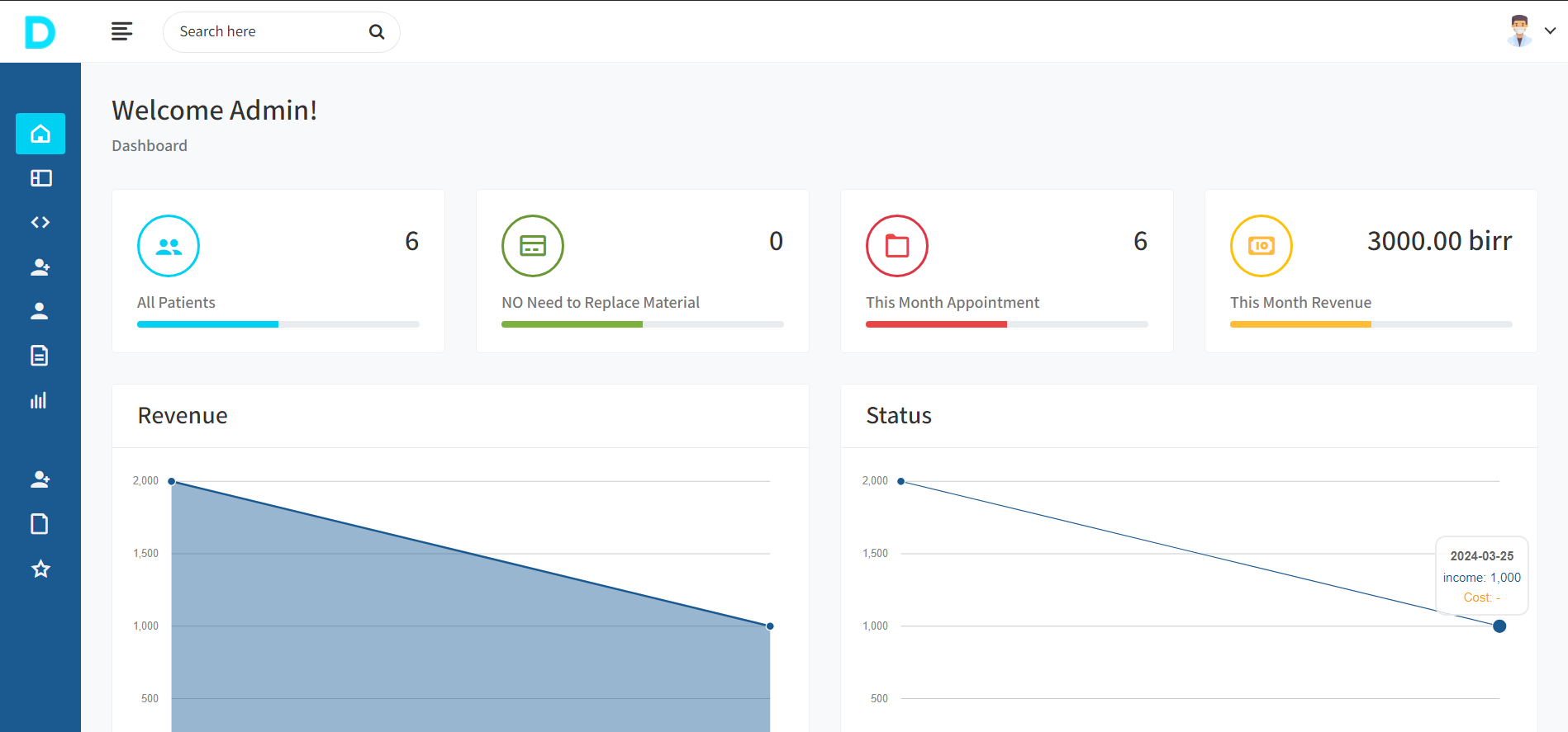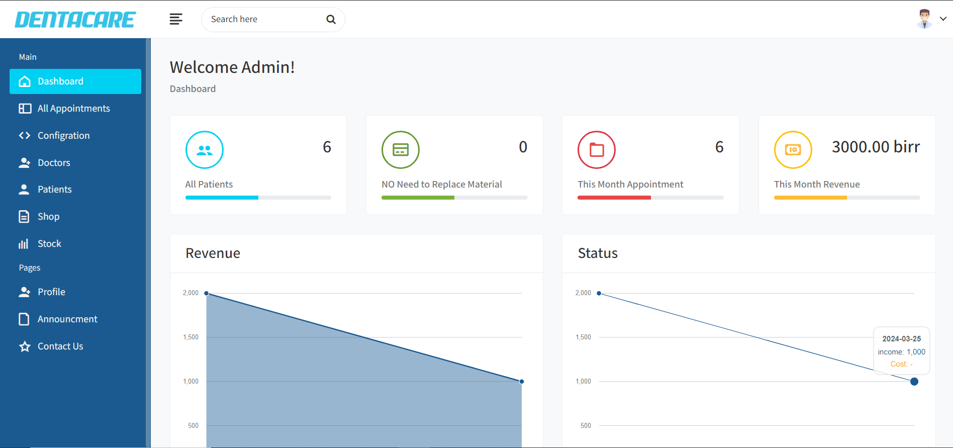 Dentacare's admin dashboard offers comprehensive oversight of clinic operations, allowing administrators to monitor patient data, appointment schedules, and staff activities efficiently.