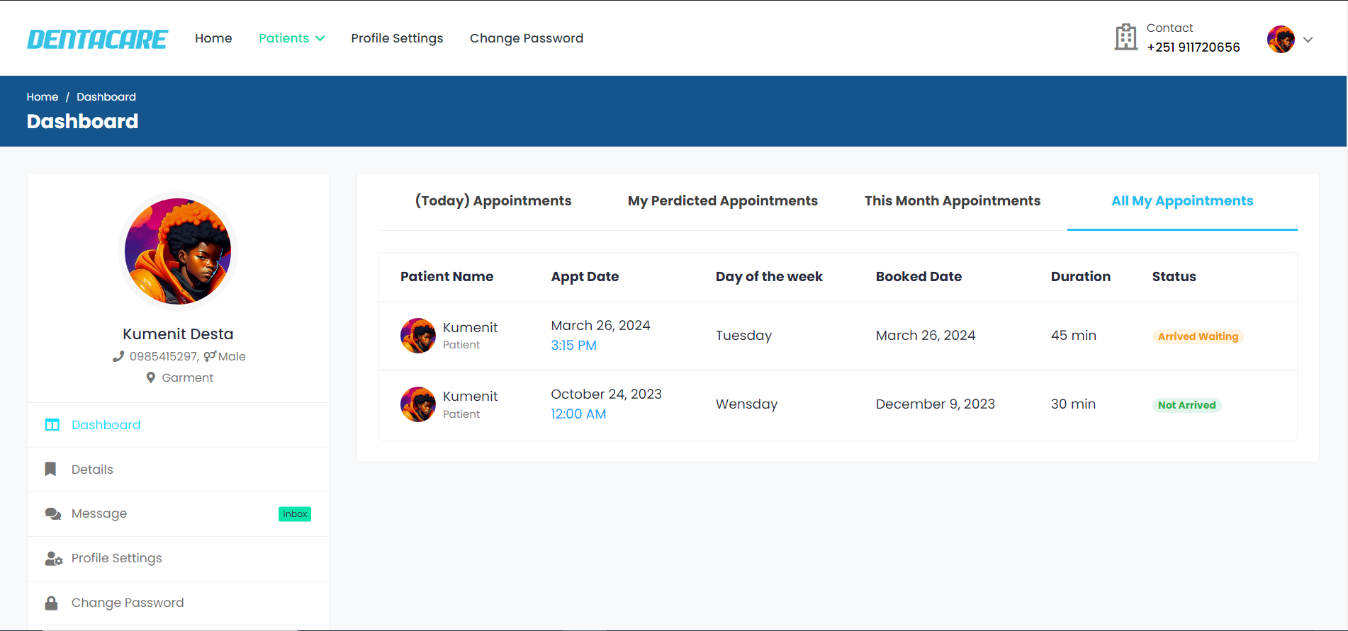 Dentacare offers patients a personalized dashboard, serving as a central hub for managing appointments, viewing health data, and receiving updates, empowering patients to take control of their dental care journey.